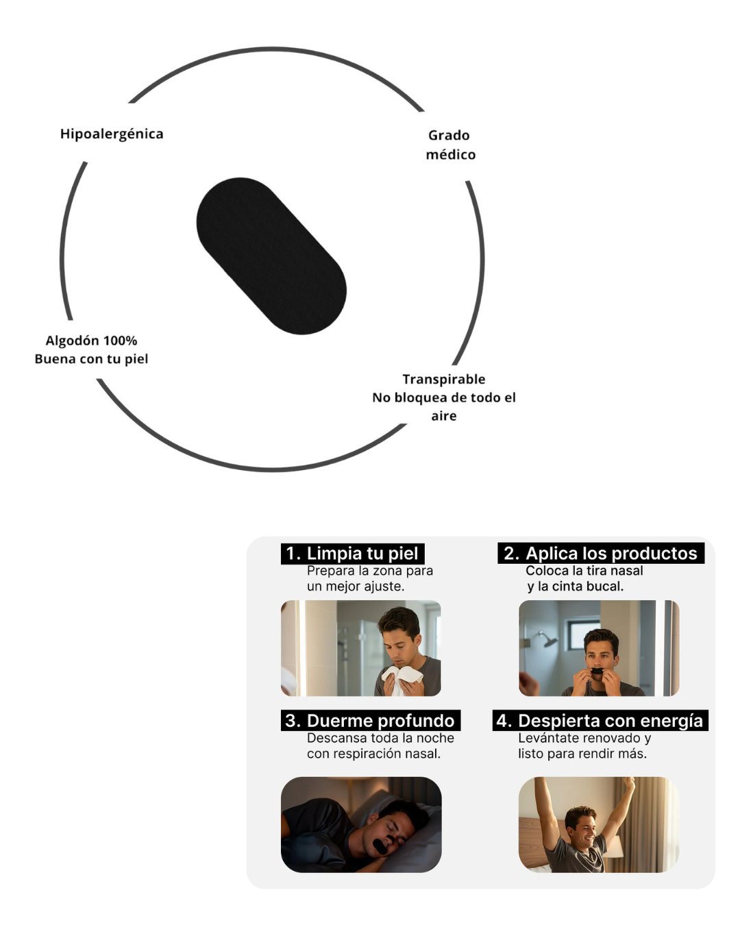 Además, para evitar precisamente la congestión nocturna, aconsejamos combinar la cinta con las tiras nasales, que ayudan a abrir los conductos y facilitan una respiración fluida toda la noche.